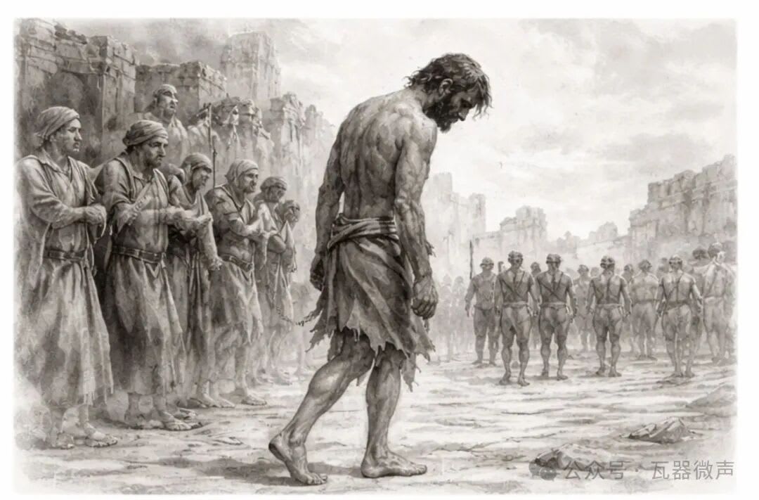 这是当时战败之人被掳时的标准羞辱状态。赤身、赤脚,意味着失去尊严、失去身份、失去保护。